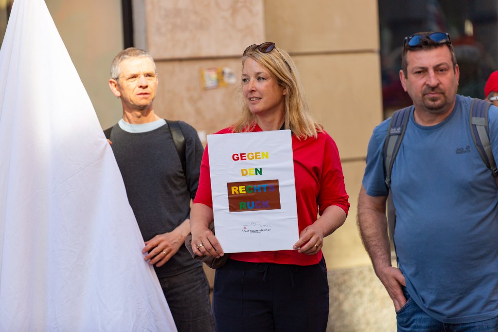 Die DGB Kreisvorsitzende Milena Brodt eröffnete die Kundgebung auf dem Marktplatz und führte durch das Programm.