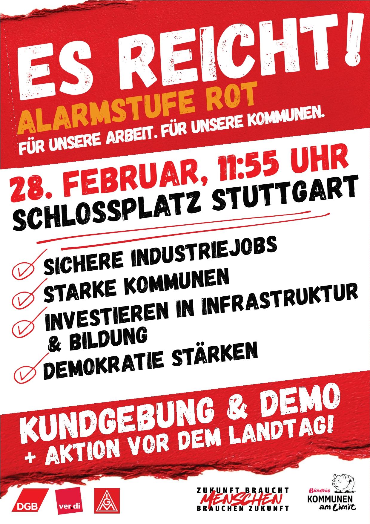 Deshalb: Kommt zur Aktion! 28. Februar, fünf vor zwölf, Schlossplatz Stuttgart. Bringt Kolleginnen und Kollegen mit. Zeigt Gesicht. Damit klar ist: Wir lassen uns unsere Zukunft nicht nehmen.